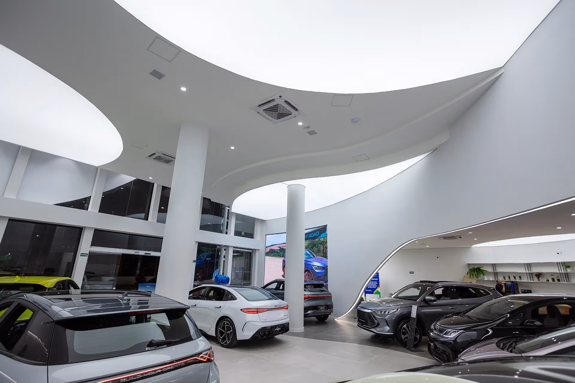 As curvas e linhas simples presentes na arquitetura interna são pensadas para refletir o caráter contemporâneo da BYD, reforçando a sensação de movimento e leveza que define a identidade visual da marca. Materiais cuidadosamente selecionados e soluções de iluminação estratégica complementam o projeto, garantindo não apenas funcionalidade, mas também uma atmosfera imersiva, tecnológica e acolhedora.