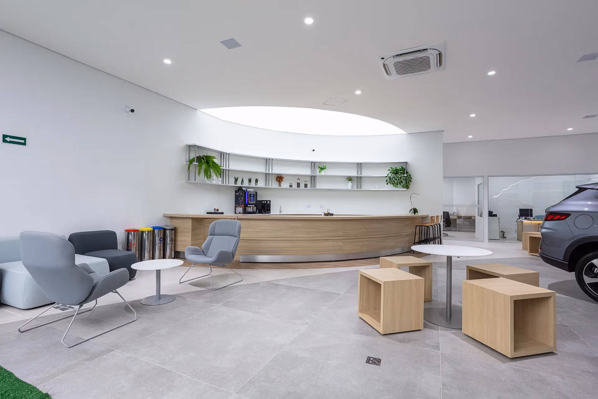 Mais do que cumprir uma demanda técnica, o objetivo era traduzir, de forma arquitetônica, a identidade da BYD — uma marca que carrega em seu DNA a inovação, a eficiência energética e o olhar voltado para o futuro da mobilidade. Esse conceito se manifesta, de forma evidente, na linguagem visual adotada para os espaços, onde as formas curvilíneas assumem papel central.
