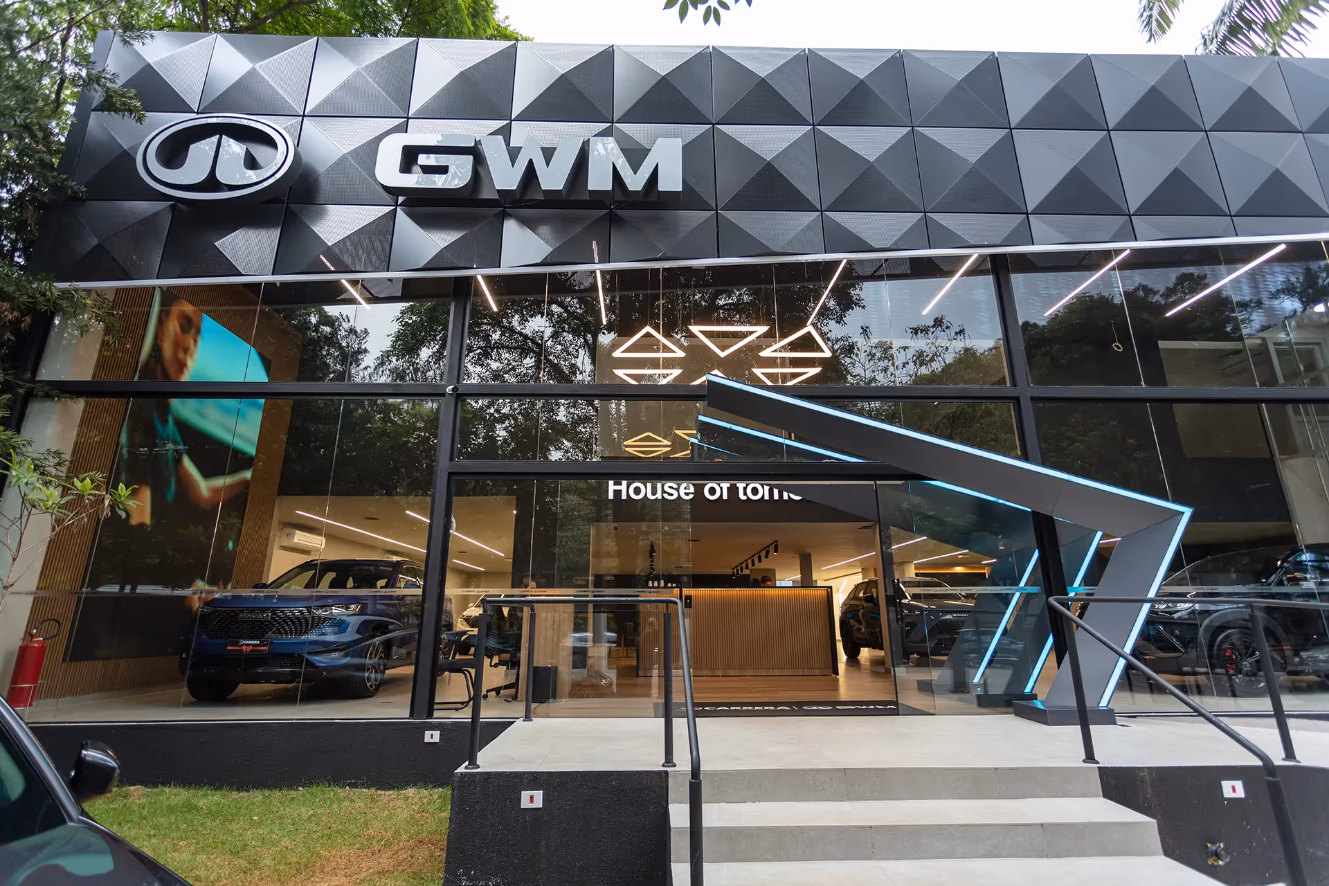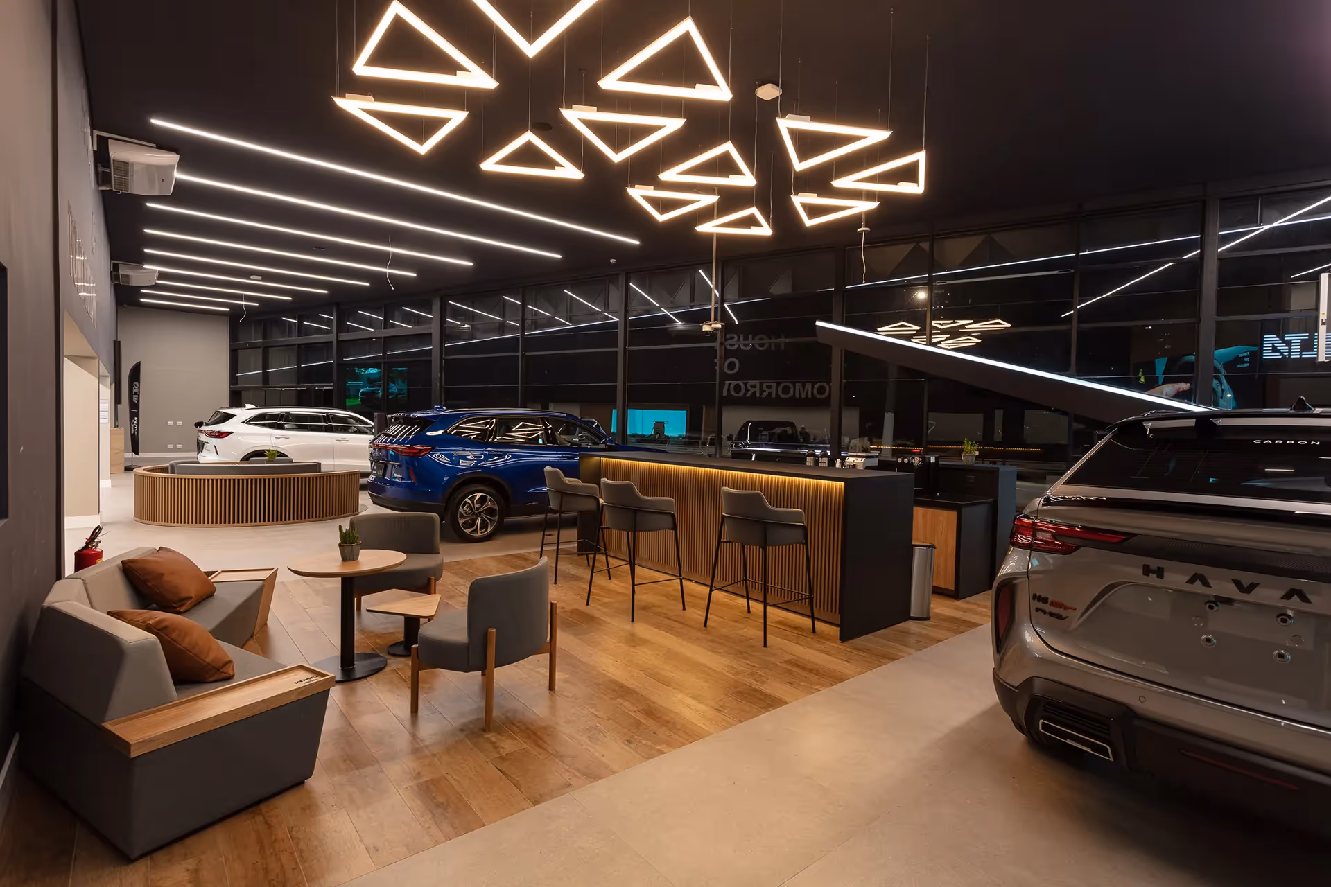 A paleta de cores neutras e materiais sustentáveis refletem o compromisso da GWM com a sustentabilidade. Elementos LED dinâmicos e iluminação inteligente criaram uma atmosfera futurista. 117 lojas de rua e 74 lojas de shopping.