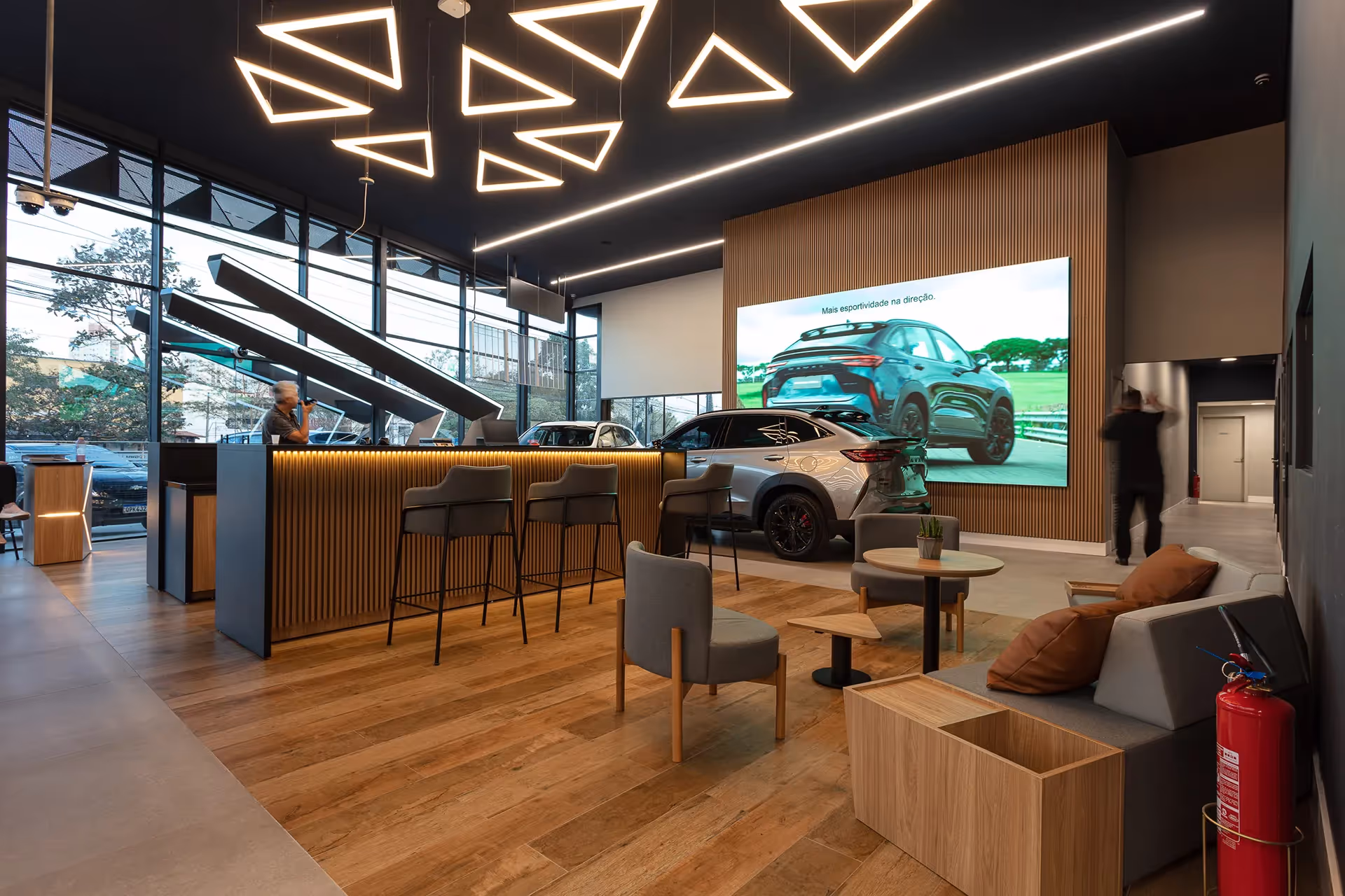 Iluminação inteligente e elementos em LED adicionam movimento e dinamismo ao ambiente, criando sensações que mudam ao longo do dia. Não se trata apenas de funcionalidade, mas de criar uma experiência sensorial que conecta as pessoas ao espírito futurista da marca.
