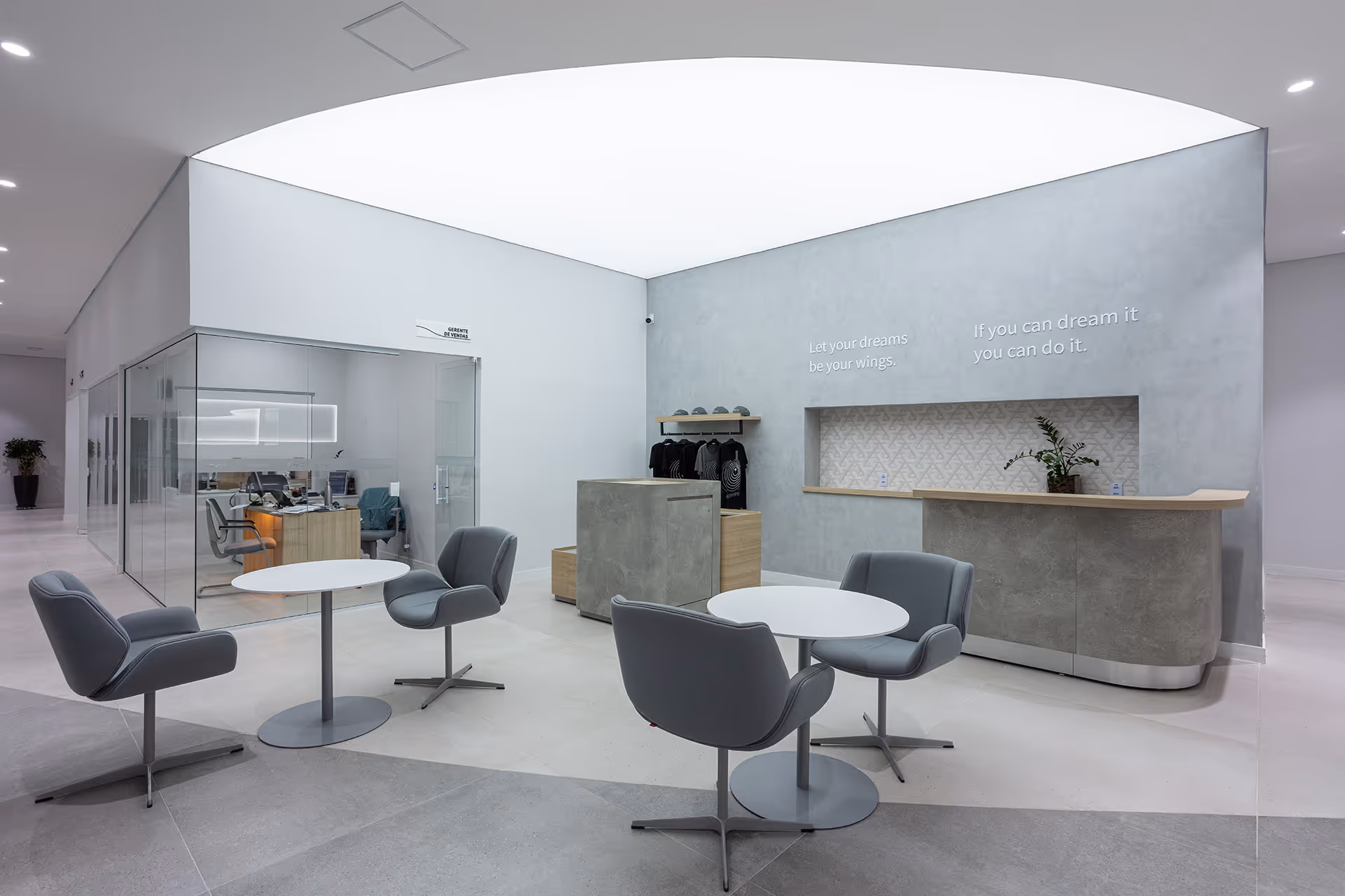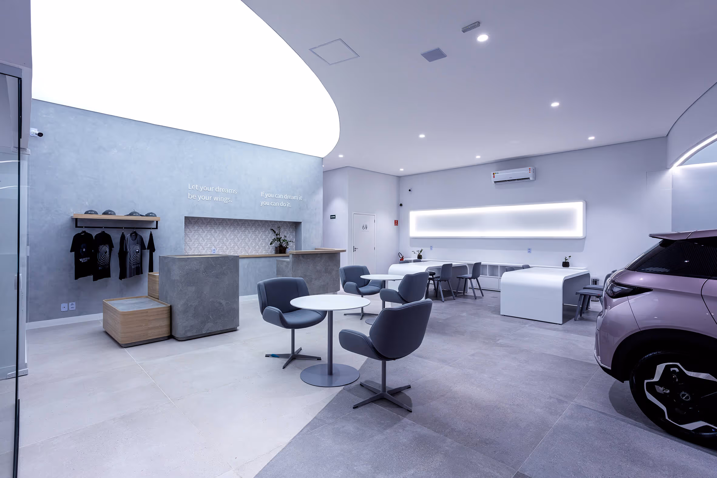 More than just meeting a technical demand, the goal was to architecturally translate BYD's identity — a brand that carries innovation, energy efficiency and a focus on the future of mobility in its DNA. This concept is clearly manifested in the visual language adopted for the spaces, where curved shapes play a central role.