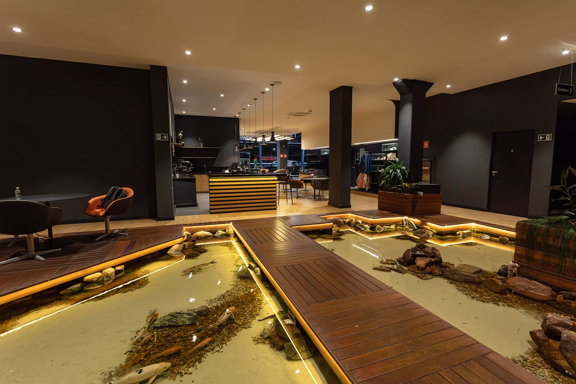 The aesthetic proposal is organized around a conceptual duality between heaven and earth — reflected in the composition of a dark, firm and solid floor, contrasting with a ceiling of clear and ethereal lines. This subtle vertical tension creates an orderly, elegant and immersive environment, where each element has a symbolic and functional function. In the center of the space, this tension materializes as a stage, where vehicles and services are presented as true works of engineering.